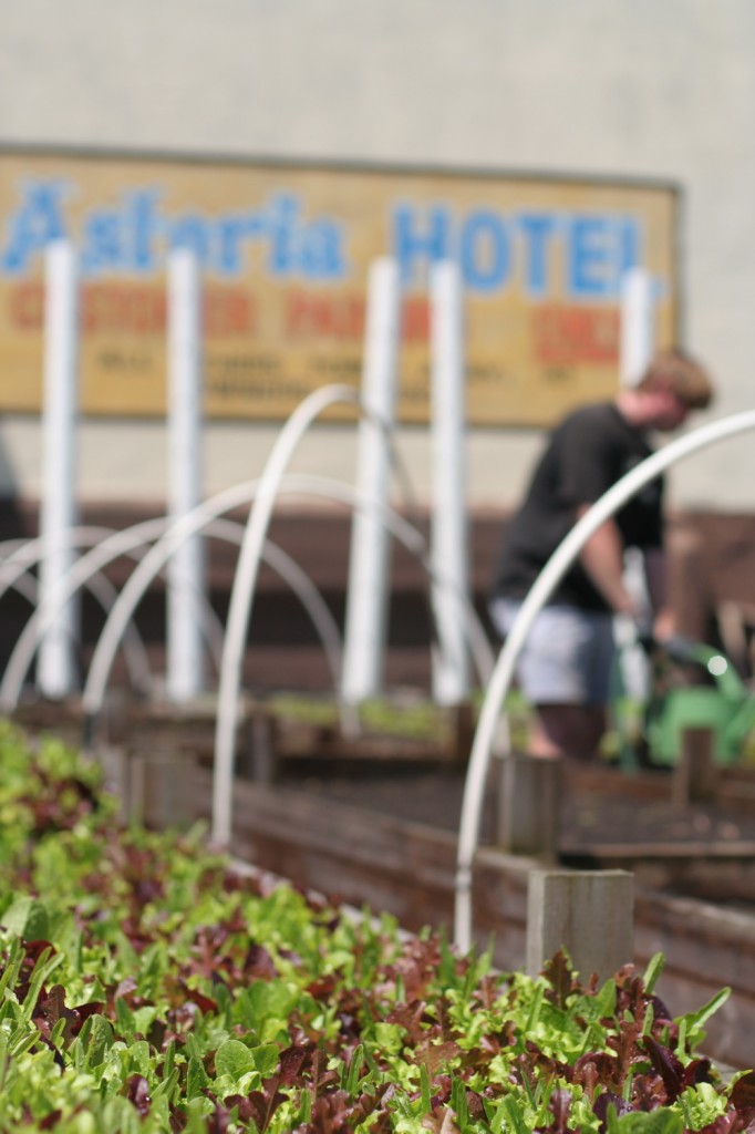 “We’ve got lettuce, Tyee spinach, bunches of arugula, French Breakfast radish, rainbow chard. We’ve been selling for two months now, mostly greens. Our tomatoes and peppers just went in,” says Seann Dory, project manager at SOLEfood Farm, a social enterprise in Vancouver’s Downtown Eastside that employs neighborhood residents to build, plant, maintain and harvest what’s become a productive urban farm on a half-acre parking lot outside the Astoria Hotel at Hawks Avenue and Hastings Street.