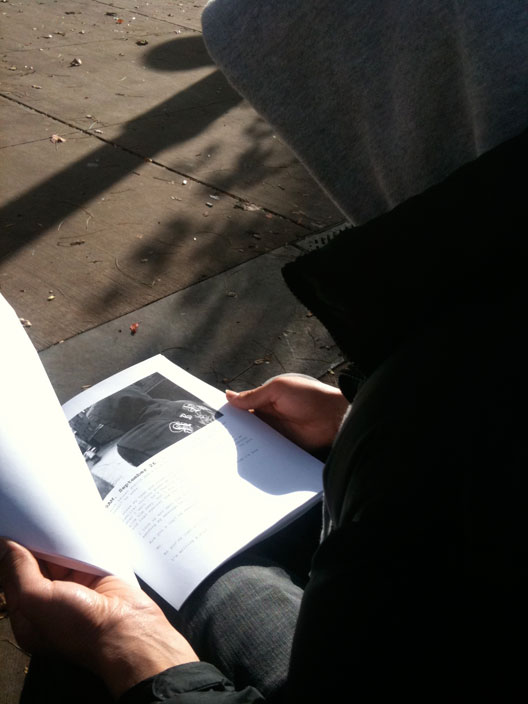 TEFLON, BY CONTRAST, is neatly groomed and well-dressed. I encounter him only once as he crosses the street, coffee and iPhone in hand, to help a young addict with a head full of grey hair who has collapsed to the sidewalk nearby. The addict struggles to his feet, tugging at his chest and steadying himself against one of the parking poles, but his legs tremble and he’s forced to sit back down.